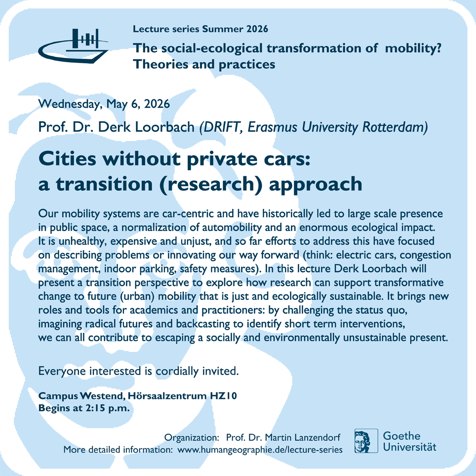 - Vortragsreihe "Geographie in der Verantwortung - Forschung trifft Praxis" der Frankfurter Geographischen Gesellschaft (FGG) am 26.11.2025