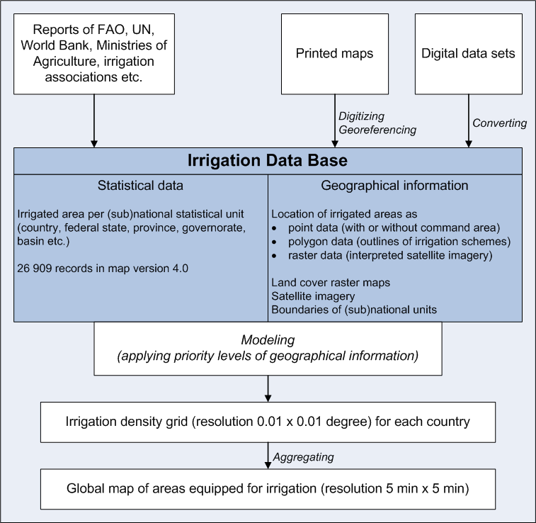 For updating, a Global Irrigation Map Generator was developed which combines a data base containing geographic information on irrigated areas (e.g. point or polygon information on the location, size of irrigation projects, raster data) and statistical information on the total irrigated area in administrative units like countries, districts or counties (scheme of mapping methodology).