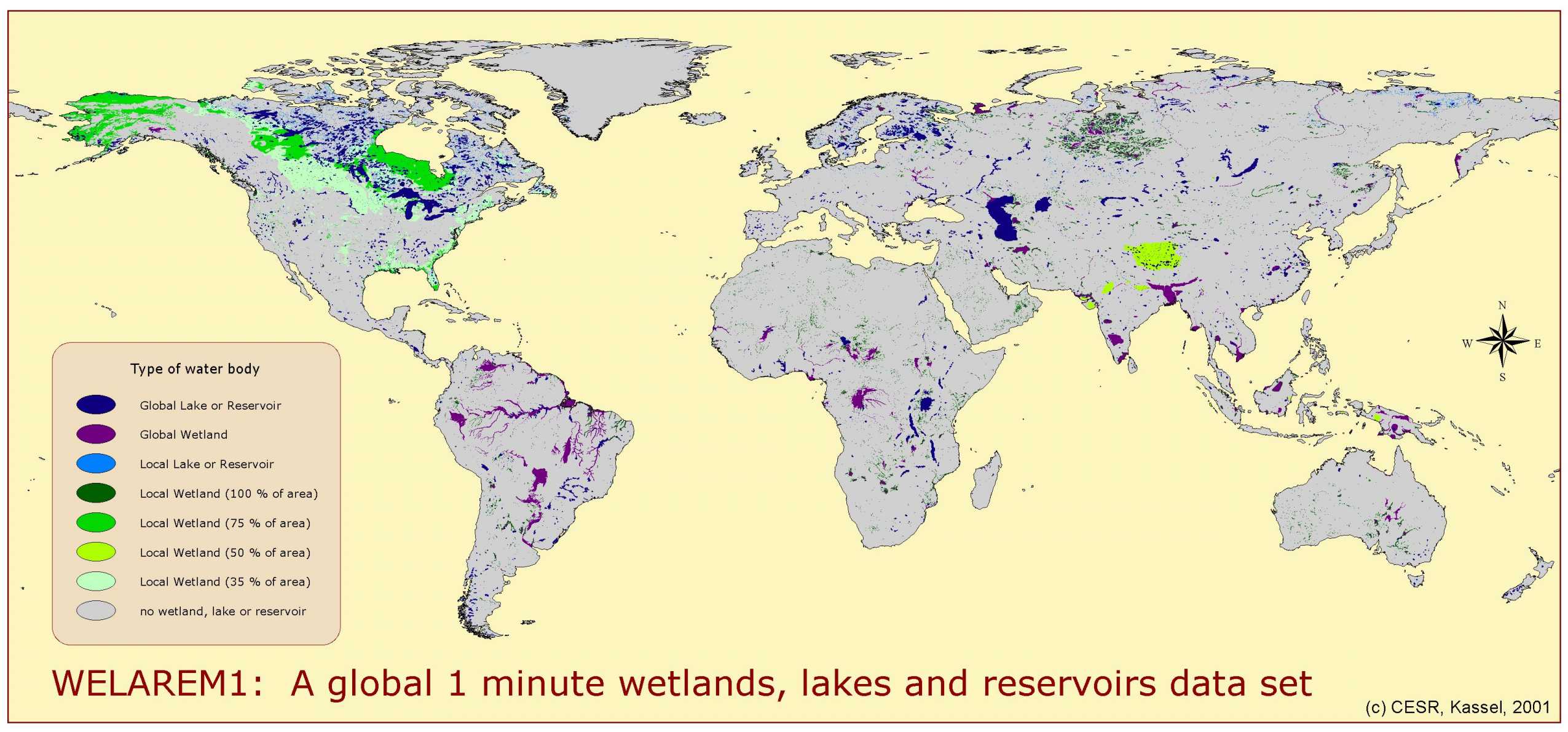 The global 1’ raster map of wetlands, lakes and reservoirs WELAREM1 was derived by combining various digital maps (ESRI, 1993 - wetlands, lakes and reservoirs; ESRI, 1992 - wetlands, lakes, reservoirs and rivers; WCMC, 1999 - lakes and wetlands; Vörösmarty et al., 1997 - reservoirs) and attribute data (ICOLD, 1998 - reservoirs; Birkett and Mason, 1995 - lakes and reservoirs). For the map generation approx. 300000 vectorized lakes and reservoirs were considered. Wetlands encompass also stretches of large rivers, as it is assumed that only a river with adjacent wetlands (floodplain) is wide enough to be drawn as a polygon on the 1:3 million map of ESRI (1992). In the generated data set, wetlands cover 6.6 % of the global land area (without Antarctica and Greenland), and lakes and reservoirs 2.1 %.