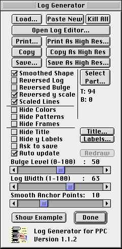 You can edit each entry. There are some variations to change the profile log graph (inversion of stack or scale, bulge degree, smoothed layers, log width, a.o.). You can print, save or copy your results as vector based PICTs in normal or high res quality. * The pattern/color value consists of a five number code: First three numbers are used for color (0 to 176), the last two numbers for pattern (1-38). For example: