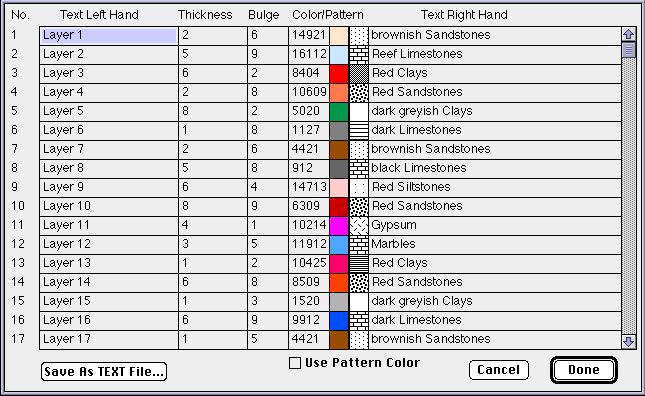 You can edit each entry. There are some variations to change the profile log graph (inversion of stack or scale, bulge degree, smoothed layers, log width, a.o.). You can print, save or copy your results as vector based PICTs in normal or high res quality. * The pattern/color value consists of a five number code: First three numbers are used for color (0 to 176), the last two numbers for pattern (1-38). For example: