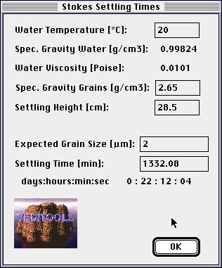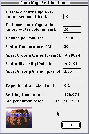 2) A Stoke's sinking time auto-calculation - you can vary water temperature, specific gravity, settling hight, grain size and the settling time. Centrifuge sinking time calculation |